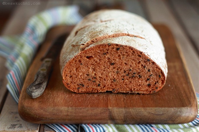 Chleb pieczemy na gorącym kamieniu lub blasze, z para przez 10 minut w temperaturze 230 stopni, a następne przez 30 minut, bez pary w temperaturze 200 stopni.